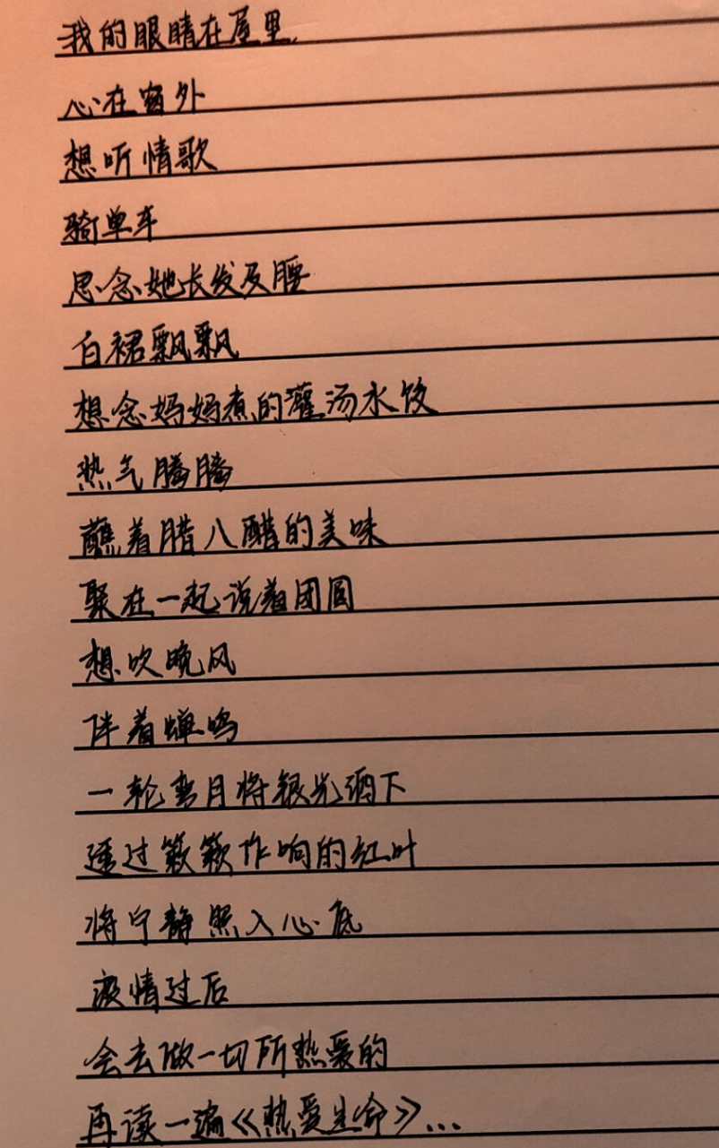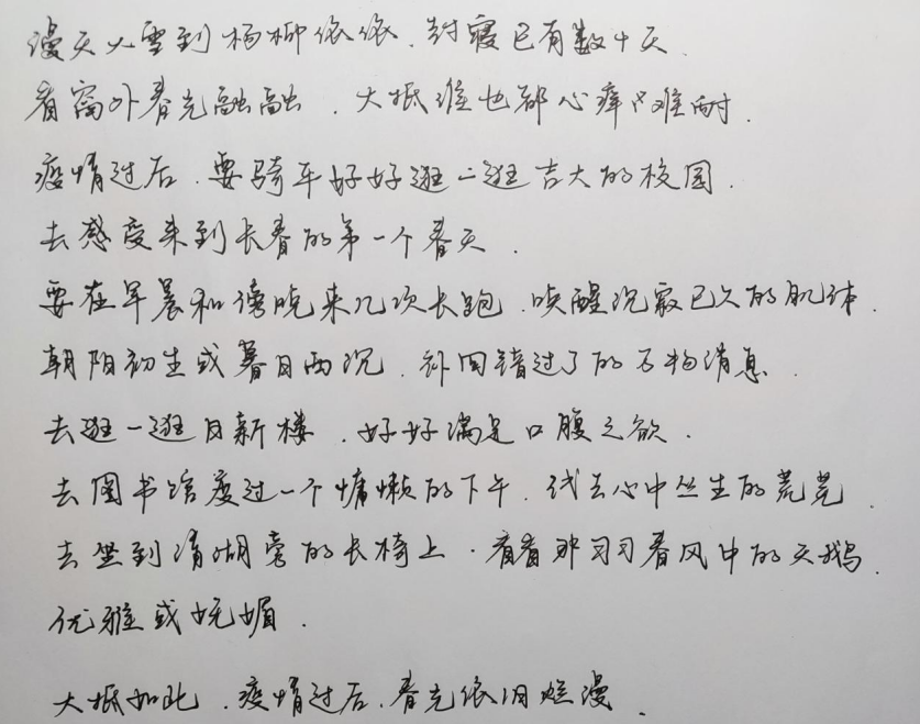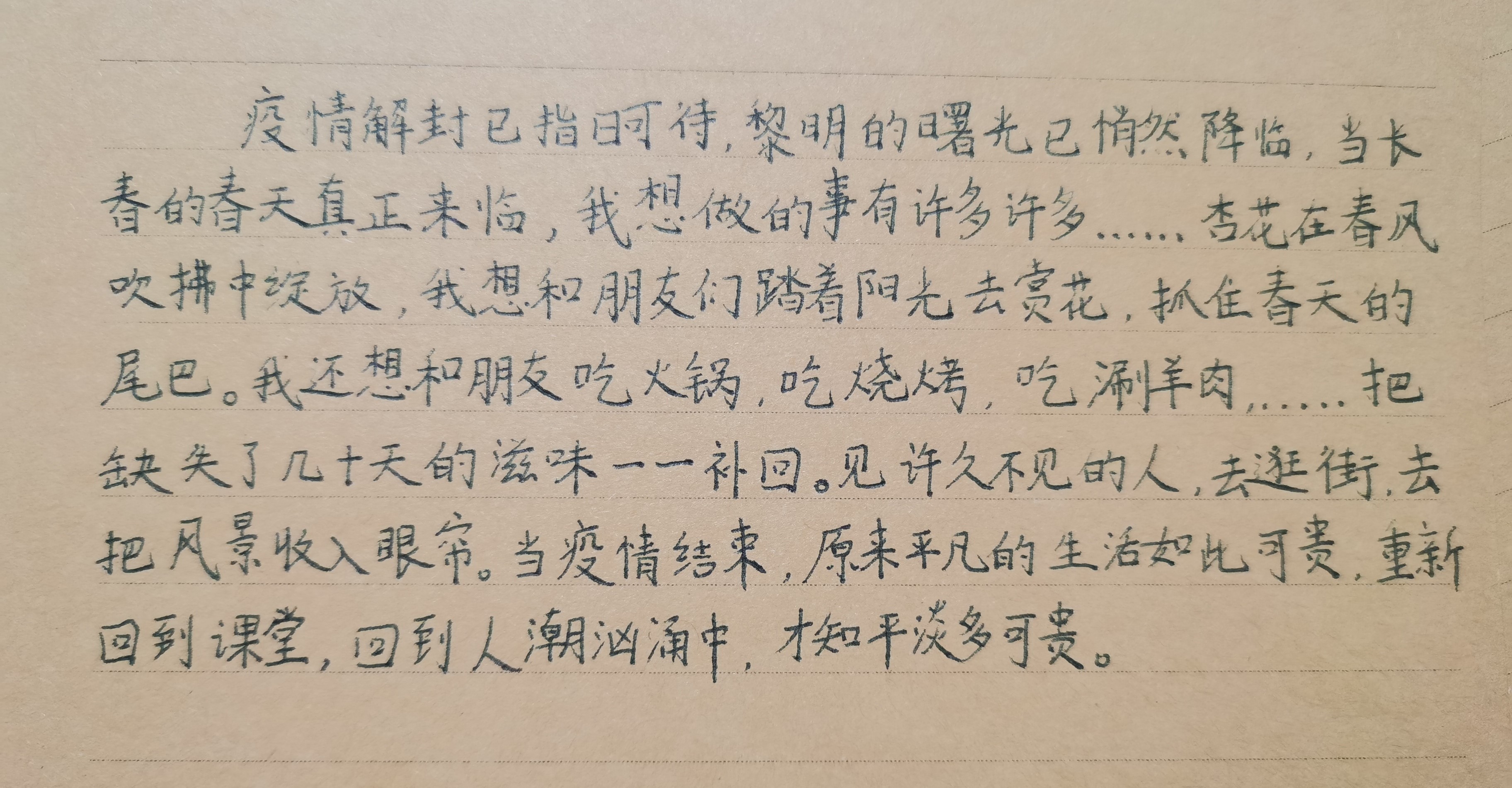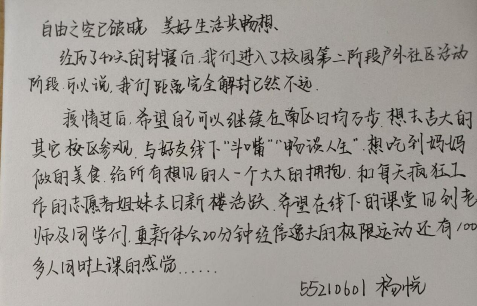 同学们对本次活动的参与热情十分高涨,纷纷通过手写文字的形式表达自己在疫情期间的所闻所感所想,并畅想了疫情结束后的生活情景。有的同学将自己的想法写成了一首小诗,有的同学用朴实的文字表达了真挚的期待。无论是和朋友美餐一顿,还是外出郊游踏青,这些美好的希冀都勾画出疫情退去后的斑斓图画,深深鼓舞了同学们以积极的心态面对当下的学习和生活。