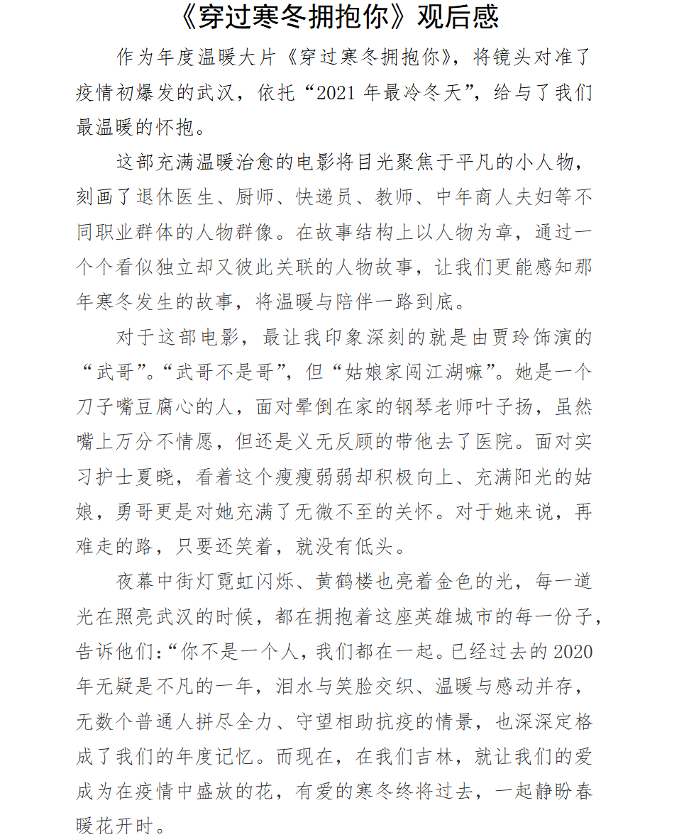 组织的此次观影活动,使同学们更深刻地认识到,疫情当下每个人都要勇于面对、勇毅前行。影片所呈现的伟大抗疫精神必将激励同学们凝聚抗疫力量,众志成城,打赢疫情防控阻击战,早日迎来如常的校园生活。希望同学们共同努力,积极配合防疫工作,为早日战胜疫情贡献自己的力量。