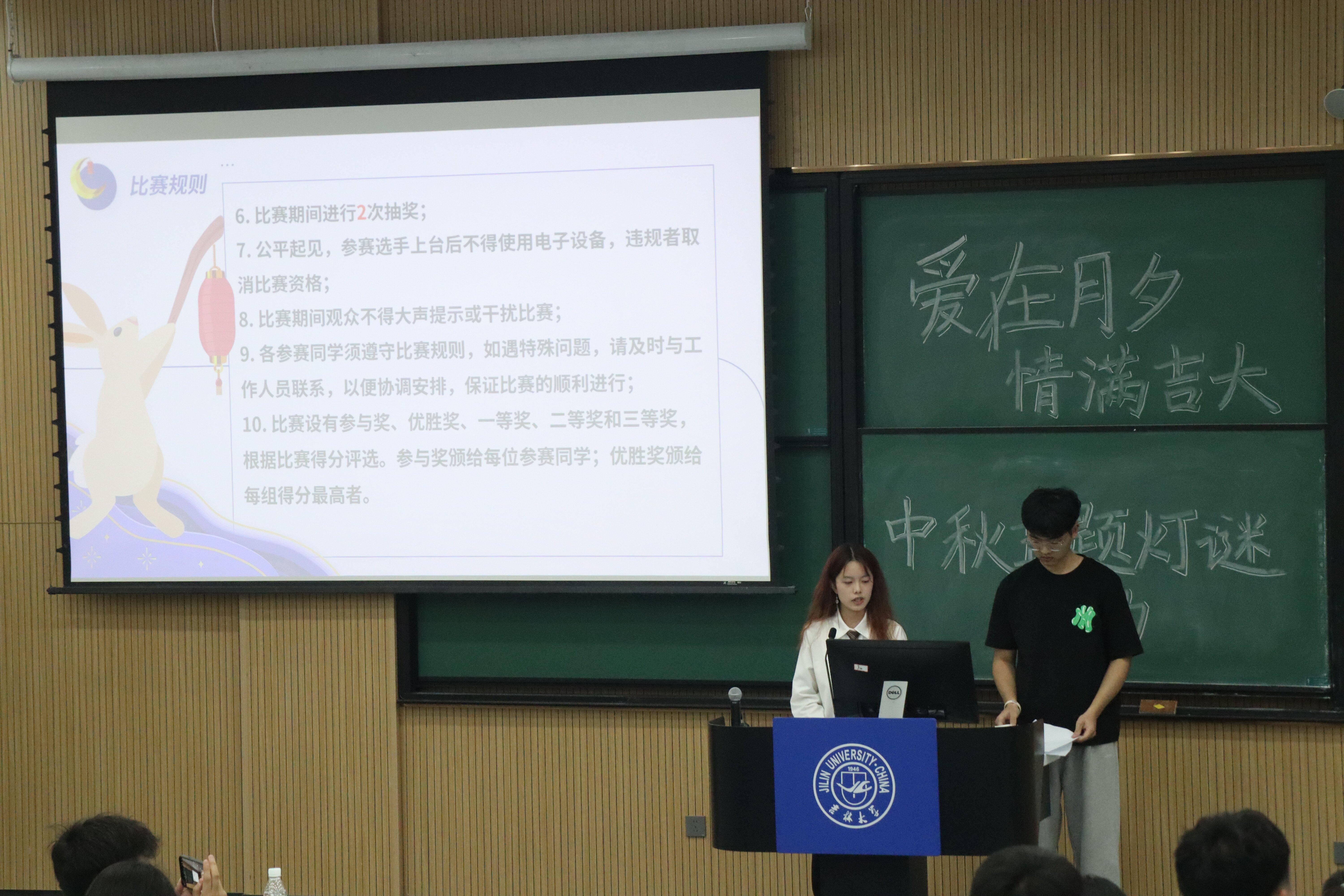 学生会宣传部于9月27日晚七点,在敬信教学楼F10阶梯教室开展了一场以“爱在月夕·情满吉大”为主题的猜灯谜大赛。同学们踊跃参与,共同感受中秋佳节的无穷魅力。
