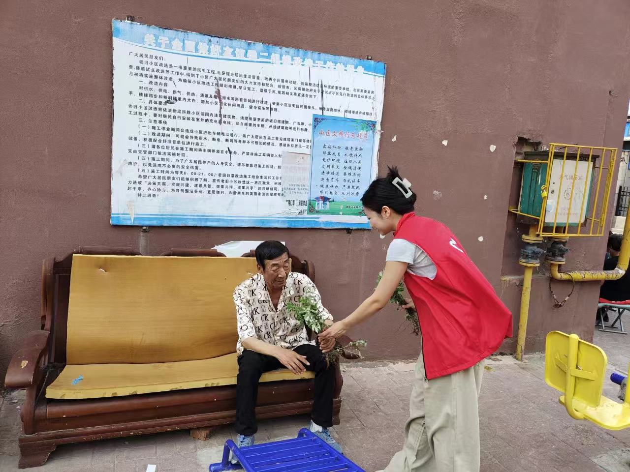 2023年6月22日上午, 志愿者们身穿红马甲, 带上精心准备的牛奶、粽子、咸鸭蛋等节日慰问品来到社区看望老人,并给老人们带来了艾草。志愿者们与老人们亲切交谈, 仔细询问他们的衣食住行和身体健康状况, 叮嘱老人们要吃饱吃好、开心娱乐、适当锻炼。