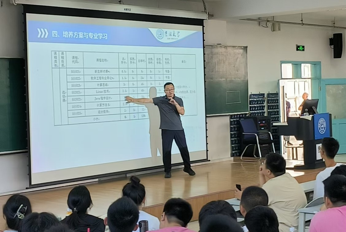 随后,柳军从师资力量、授课方式和考核方式等方面对学院的卓越工程师培养计划进行了详细解读。他通过分享优秀学长学姐的事迹,激励学生们要积极进取,勇于追求卓越,并且还强调了大学时光的宝贵,提醒学生们要充分利用学院提供的资源和机会,提升综合素质和竞争力。柳军指出,软件行业发展迅速,唯有通过不断学习和进步,才能在未来职业生涯中保持竞争力。