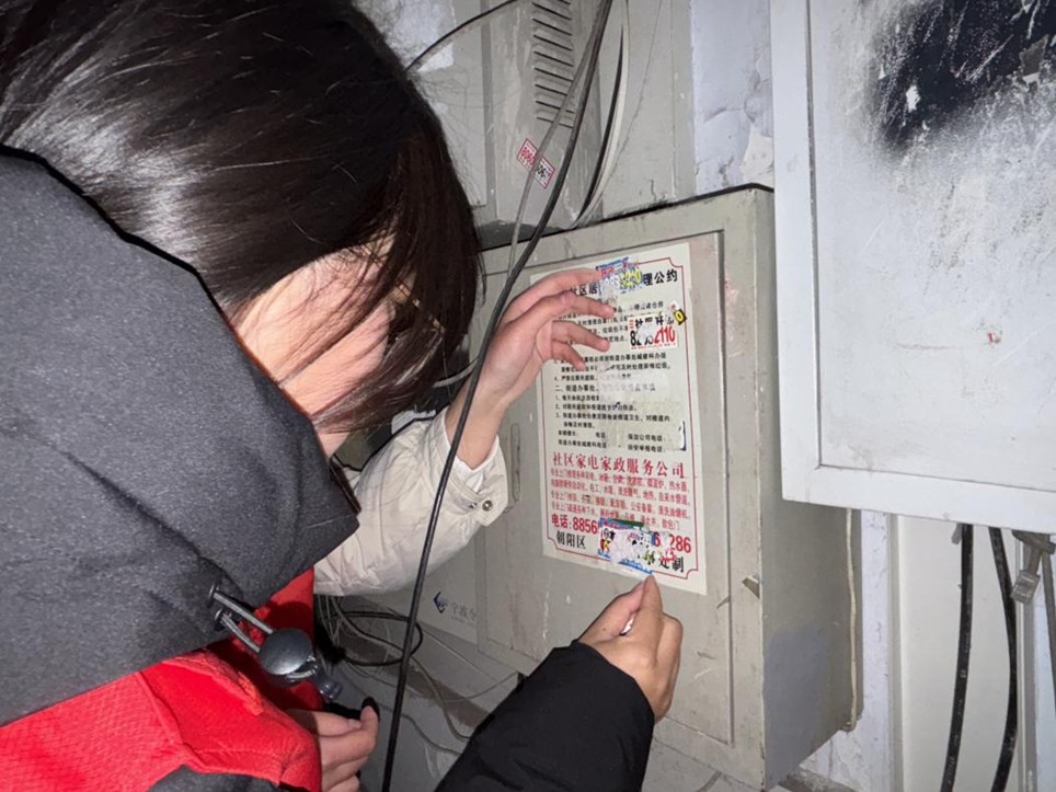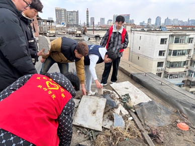 活动当天,志愿者们在社区工作人员的统一安排下分组开展工作。在楼道清理环节,女生志愿者手持铲刀、喷壶、抹布等工具,细致清除墙面和楼梯间张贴的违规小广告。面对顽固张贴物,志愿者们采用“一喷、二铲、三擦拭”的清洁流程,逐层推进,有效改善了社区卫生环境,提升了居民居住体验。与此同时,男生志愿者组成清运小组,对楼道内堆放的杂物和顶楼闲置瓦片等障碍物进行集中清理,及时消除消防安全隐患,进一步优化了通行空间,保障居民出行安全。