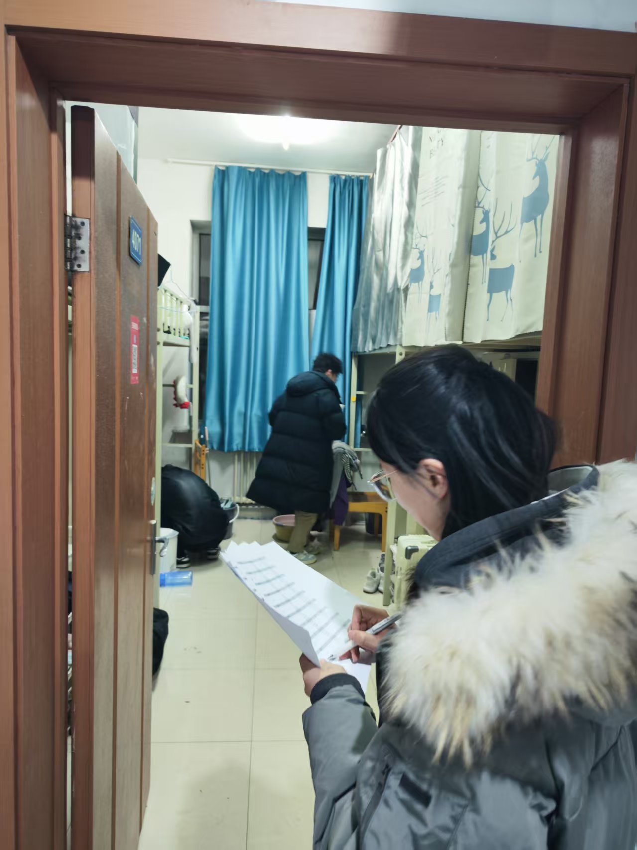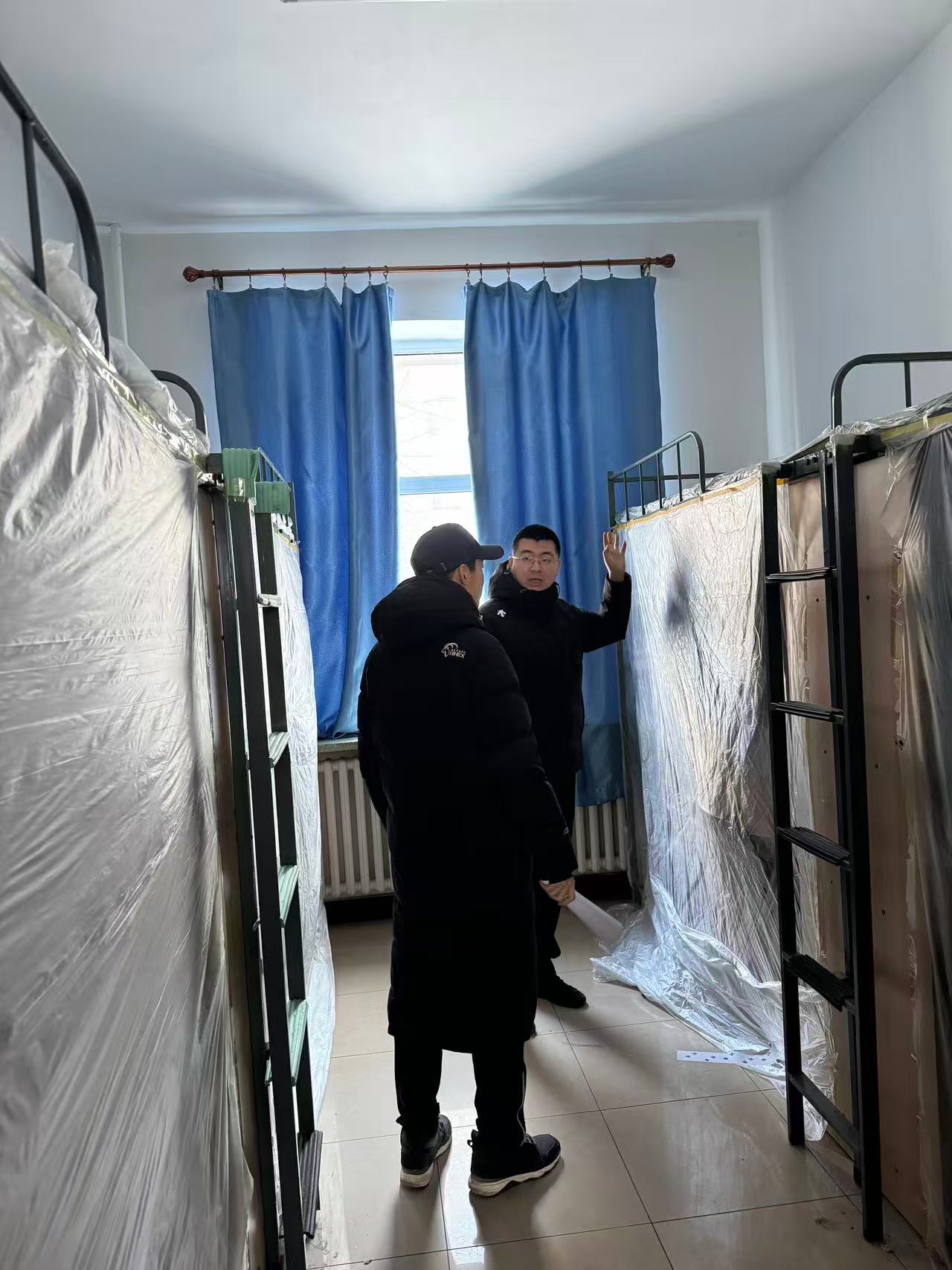 本次走访检查围绕工程施工准备与假期安全保障两方面展开。针对空调安装电气系统改造的要求,重点检查了学生个人物品整理情况:督促学生们将零散物品收纳至储物柜并上锁,贵重物品随身携带或妥善保管;逐一核查床帘等寝具是否拆除,床铺及周边空间是否清空,窗台物品是否收回,确保施工区域畅通无阻。针对北苑一公寓重点围绕宿舍用电安全、防火防盗、卫生环境等方面展开,对登记的留校学生进行确认。检查过程中,老师们逐一排查了违规电器使用、电源关闭、阳台杂物堆积等潜在风险,耐心叮嘱离校同学务必做到断水断电、关窗锁门,妥善保管个人贵重物品。