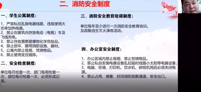 培训会上董老师首先介绍了做好消防安全工作的重大意义,强调学生公寓是人员密集场所,做好消防安全工作,预防和减少火灾事故非常重要。其次董老师介绍了具体的消防安全制度,并提出要持续加强消防 “检查消除火灾隐患能力”、“扑救初期火灾能力”、“组织疏散逃生能力”和“消防宣传教育能力”建设。随后,董老师列举了多个触目惊心的火灾案例,用鲜明的案例警醒师生要时刻将消防安全谨记心中。董老师又详细介绍了在学生公寓内使用电器的注意事项,如不要私接线路、不要使用不合格的电子产品、不要使用大功率电器、在一个插排上不要连接过多电器、不要长期使用某一个插排、不要长时间充电电子设备等,强调不要在宿舍内存放易燃易爆物品。最后,介绍了灭火器材的使用方法及逃生方法。